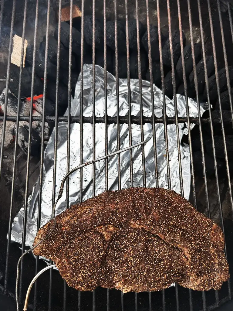 • The Smoke Phase: Place the roast on the indirect side. Smoke until internal temperature reaches 165°F.
